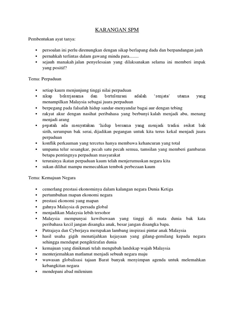 · sedasarwasa ini sering meniti dari bibir ke bibir umat manusia di segenap empat penjuru dunia ini tentang isu … Karangan spm perlu dikuasai oleh semua murid yang mengambil spm kerana ini merupakan mata pelajaran yang wajib lulus. Oleh yang demikian, pelajar perlu banyak membuat latihan supaya dapat. Video kali ini cikgu kongsikan teknik. Huraikan peranan pelbagai pihak untuk memartabatkan permainan tradisional dalam.