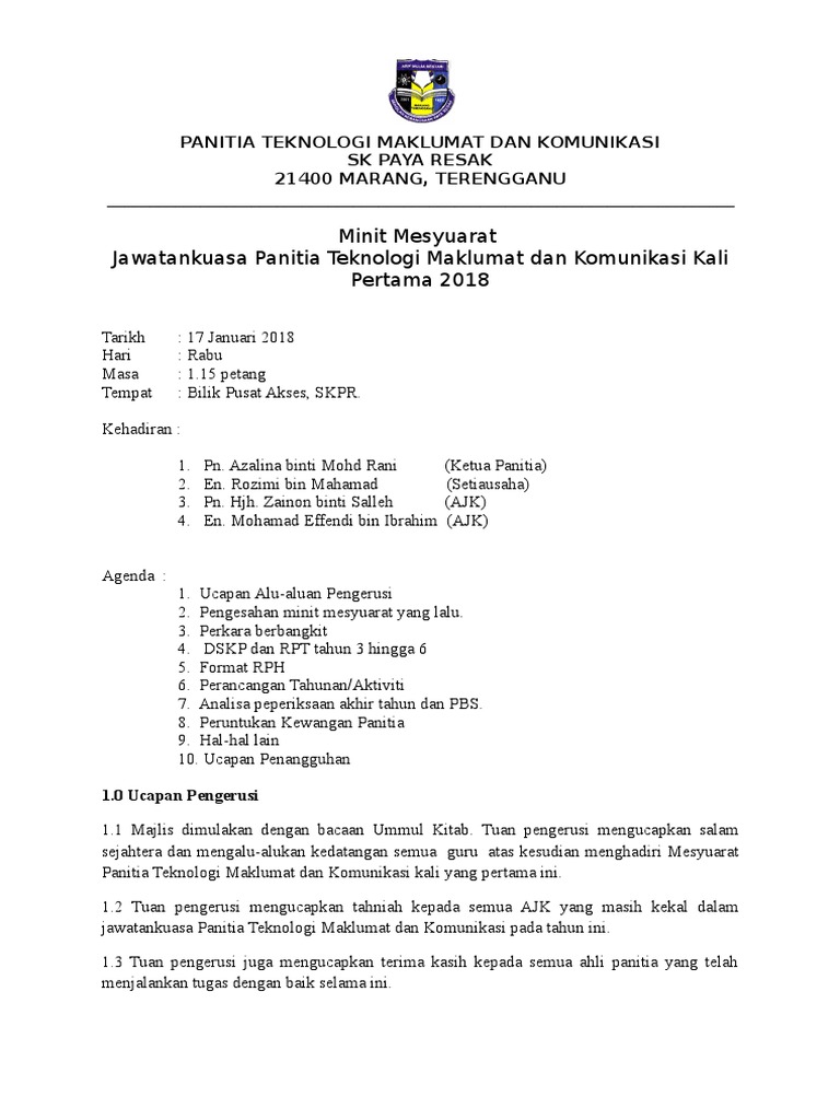 Minit Mesyuarat Tmk Kali 1 2018 Docx Sk Jalan Raja Muda Kuala Lumpur Minit Mesyuarat Panitia Teknologi Maklumat Dan Komunikasi Bil 1 2018 Tarikh 28 Course Hero from www.coursehero.com Sila sebarkan sekiranya para guru menemui bahan ini bermanfaat kepada semua. Bob sirajul mohd zuki rohaiza marzuki ucapan pengerusi i. If you continue browsing the site, you agree to the use of cookies on this website. Diharapkan pada percutian akan datang, pemilihan lokasi harus menitikberatkan kesesuaian serta menarik dan menyeronokan. Mesyuarat pembinaan item modul gemilang sejarah spm dan pmr 2009 diadakan di pulau pangkor pada kali ini. Diharap semua ahli merujuk kepada makluman mesyuarat yang telah disampaikan kepada setiap ahli untuk perincian mesyuarat. Ucapan penangguhan 6.1 mesyuarat ditangguhkan pada pukul 3.30 petang. 14.3 hari interaksi waris prasekolah kali pertama akan diadakan pada 23 jun 2016 nanti jam 11.30 pagi.