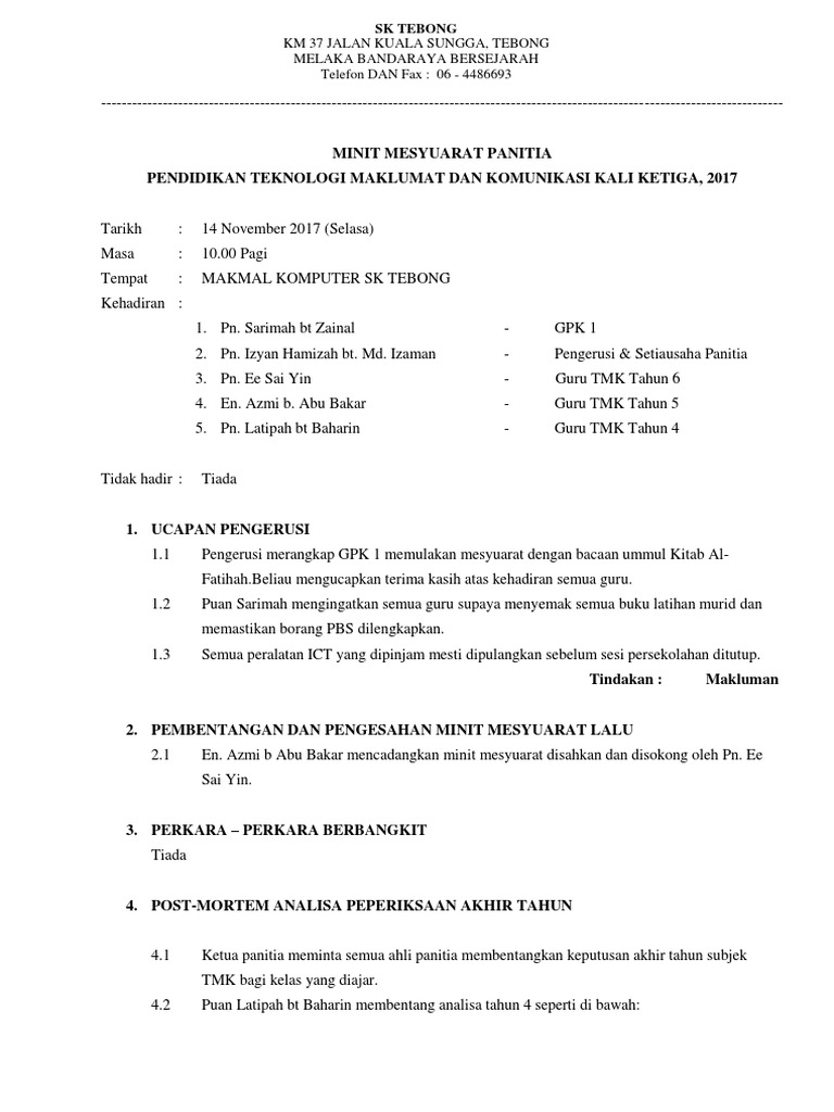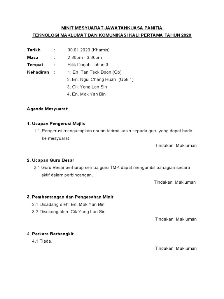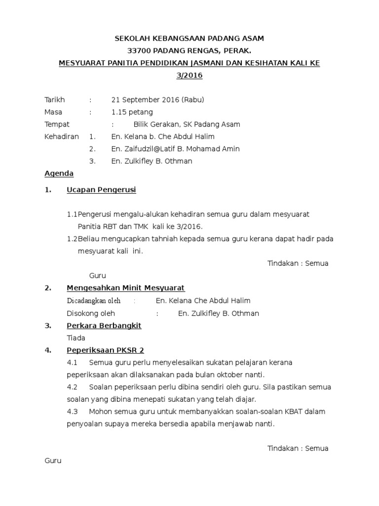 Minit mesyuarat panitia tmk bil 1 /2017 tarikh. Minit mesyuarat jawatankuasa aset kedua. Sjk(t) air kuning selatan 73200 gemencheh, negeri sembilan darul khusus, tel : Assalam pada semua ahli bantu malaysia. Dokumen ini juga mengandungi catatan keputusan atau persetujuan telah dicapai dalam perbincangan. Pengerusi mengucapkan ribuan terima kasih kepada semua guru yang menghadirkan diri dalam mesyuarat panitia tmk buat kali pertama sesi 2017 2. Minit mesyuarat panitia bahasa melayu kali kedua. Pn nurul hani binti mohd fauzi. Pn.siti norbaya mencadangkan minit mesyuarat disahkan dan disokong oleh pn nooryani. Persatuan bersetuju dengan pemilihan lokasi percutian kali ini. South kedah crc, kulim, kedah. Report minit mesyuarat kali kedua. Diharap semua ahli merujuk kepada makluman mesyuarat yang telah disampaikan kepada setiap ahli untuk perincian mesyuarat.